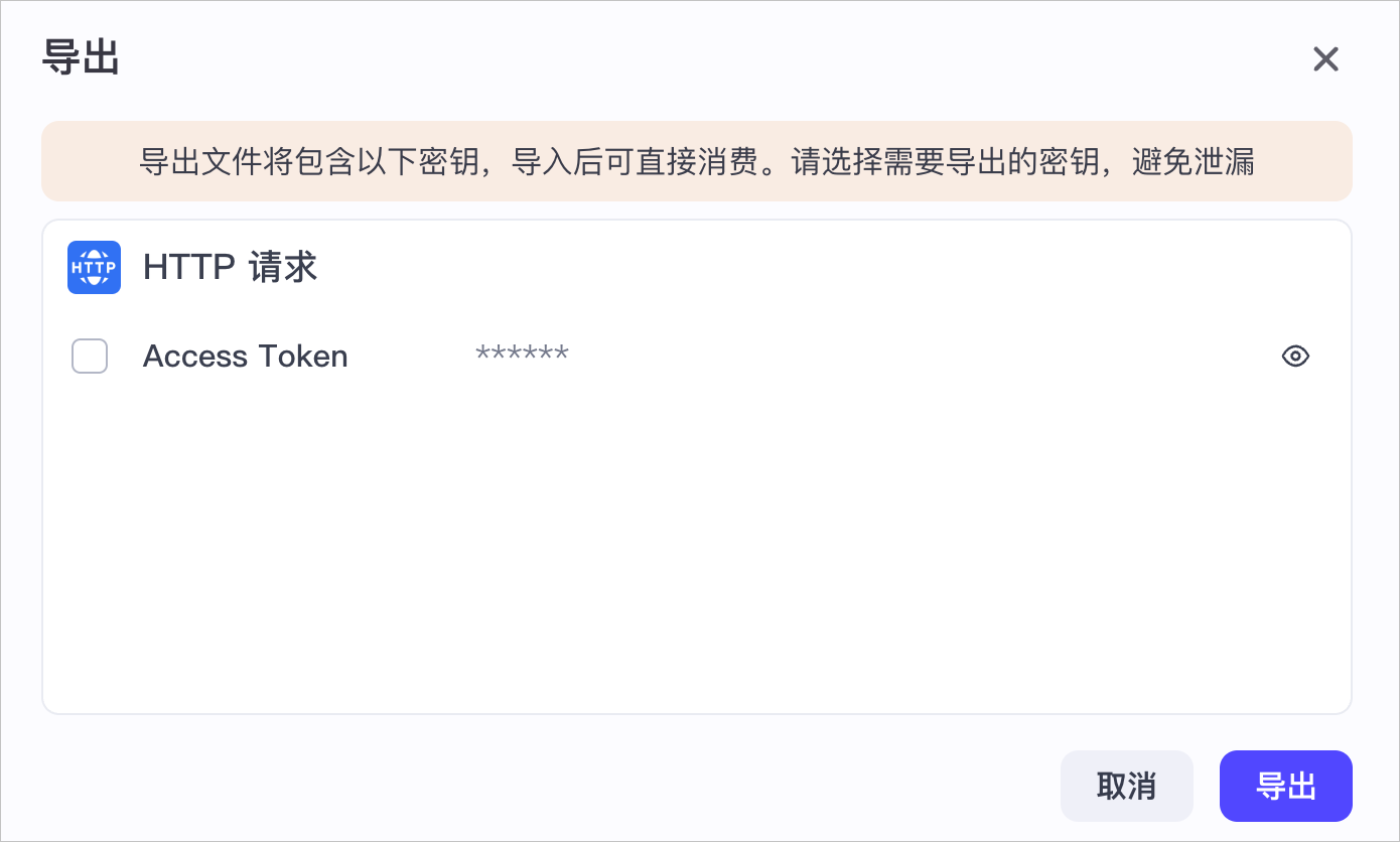 导出工作流时,系统会自动检测工作流中的敏感信息(如 HTTP 节点的鉴权信息),并提示是否同步导出。