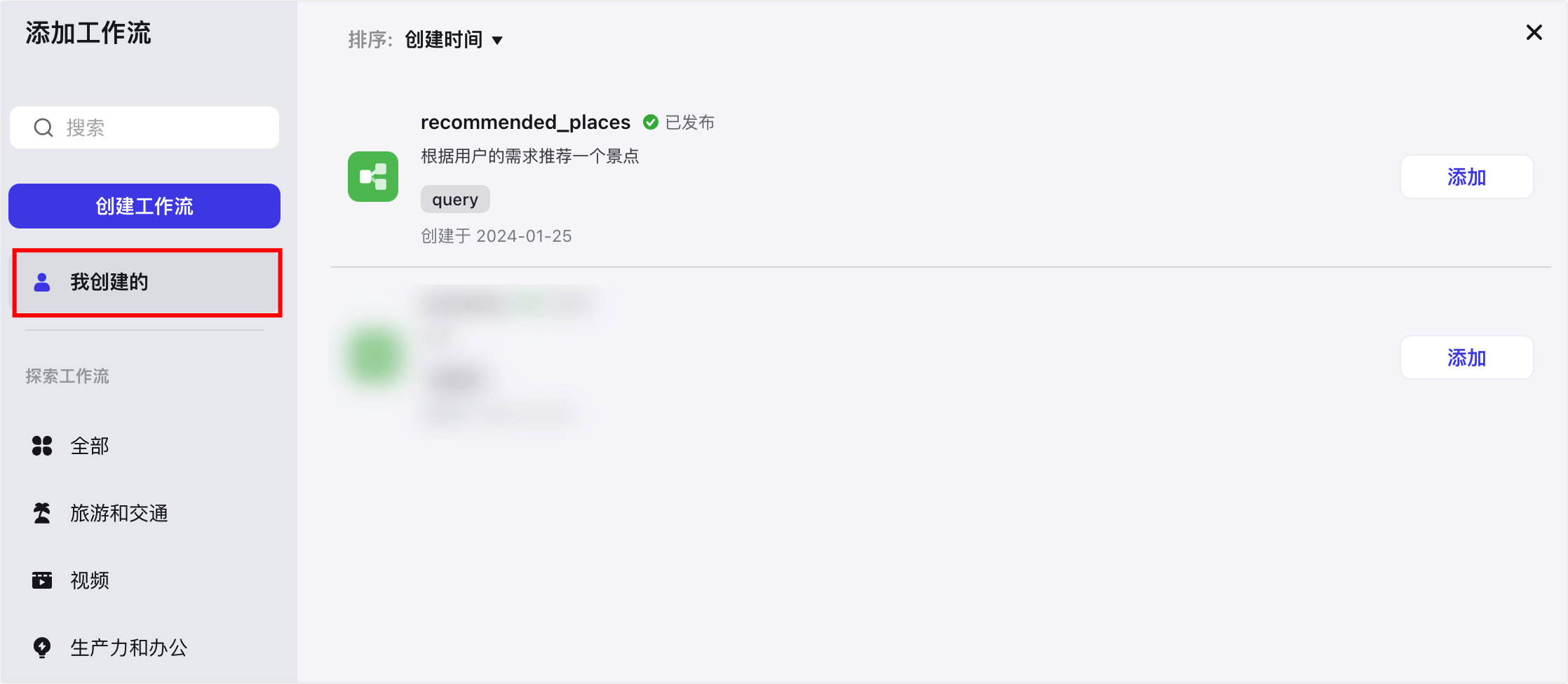 在资源列表中,找到工作流,然后选择一种添加方式。