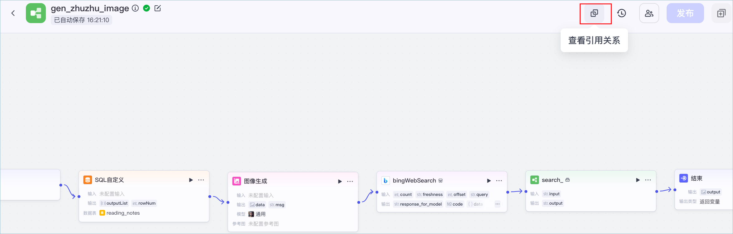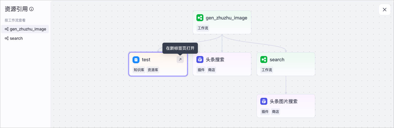 资源引用页面展示扣子工作流引用的子工作流、插件、数据库、知识库等资源,箭头从 A 指向 B 表示 A 引用了 B。例如在下图中,gen_zhuzhu_image 工作流直接引用了 test 知识库、头条搜索插件和 search 工作流。你还可以单击资源卡片,在新标签页中查看资源详情。