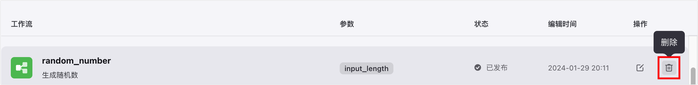 对于不再需要使用的工作流,你可以在工作流列表内找到该工作流,并在操作列单击删除图标。