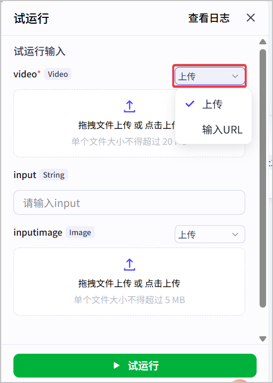 如果输入参数包含图片、视频等文件类型,试运行时可以上传文件或输入文件 URL。