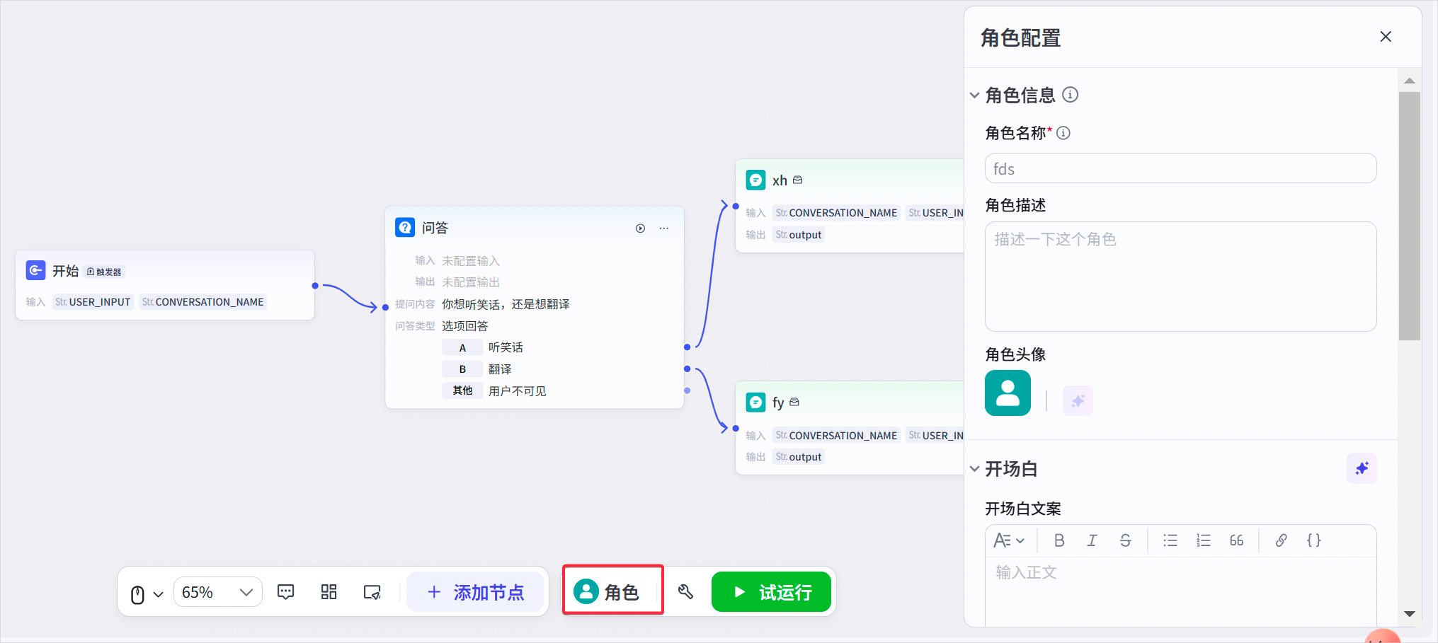 如果 AI 对话组件配置了角色属性,则优先采用 AI 对话组件的配置;若智能体处于对话流模式并绑定了对话流,则以智能体中的角色配置为准。